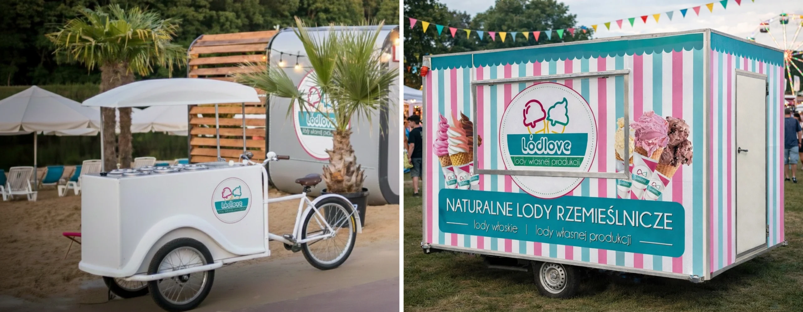 - W środku/w plenerze – możemy ustawić kompaktowy rowerek lodowy o powierzchni około 2 m², który bez problemu zmieści się w restauracjach, galeriach czy mniejszych przestrzeniach eventowych.